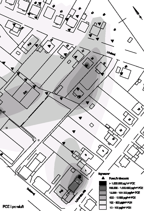 grundvandsforurening på renserigrunden, og en terrænnær forureningsfane (poreluft), der