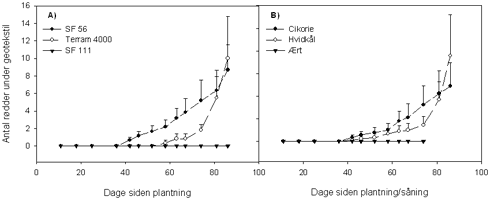 3.1 Forsøg AFigur 3A viser resultaterne fra forsøg A, hvor det ses at alle geotekstiler blev gennemgroet i løbet af forsøgsperioden på 63 dage. Generelt ses en sammenhæng mellem porestørrelsen og rodudviklingen under geotekstilet, således at tekstiler med mindst porestørrelse forsinkede rodudviklingen mest. Der var fx ca. 16 dages forsinkelse i rodudviklingen under de tætteste tekstiler med porestørrelsen 80 og 85 µm (henholdsvis SF 56 og T4000) i forhold til de mindre tætte tekstiler med porestørrelsen 180 µm (SF27 og T700). Disse forskelle er signifikante i perioden fra dag 28 til 49. Det tætteste tekstil med porestørrelsen 55 µm (SF111) forsinkede rodudviklingen signifikant med ca. 30 dage i forhold til de groveste kvaliteter, og den lavere hældning af linien for det tætteste tekstil antyder at rodudviklingen ikke blot var forsinket men også var langsommere i forhold til de øvrige tekstiler. Både gulerod og lucerne groede igennem SF111. Figur 3B viser resultaterne fra forsøg A for gulerod og lucerne. Der ses ingen signifikante forskelle mellem de to arter. Generelt var der ingen interaktion mellem geotekstil og art i forsøg A.