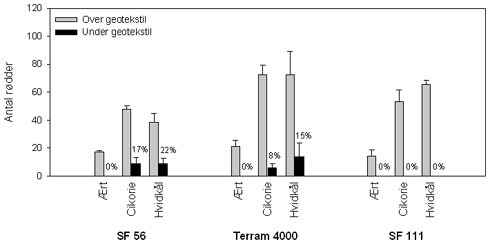 (forsøg A) 3.2 Forsøg BFigur 4 viser at rodudviklingen generelt var meget langsommere i forsøg B end i forsøg A. Figur 4A viser resultaterne for geotekstilerne for hvidkål og cikorie. Ært er ikke medtaget i beregningerne da den som forventet havde en svag rodvækst og ikke groede igennem nogen af geotekstilerne. Det ses at SF111 (55 µm) hindrede al rodudvikling under geotekstilet, mens T4000 (85 µm) havde en signifikant lavere rodvækst end SF56 (80 µm) ved optællingerne på dag 46 og 52. Figur 4B viser resultaterne fordelt på de tre arter i forsøget, hvor ært ikke groede igennem nogen af tekstiltyperne i modsætning til cikorie og hvidkål. Der var ingen signifikante forskelle mellem de to sidstnævnte. Generelt var der heller ingen interaktion mellem geotekstil og art i forsøg B. I Figur 5 ses antallet af rødder over og under geotekstilet samt antal rødder under tekstilet i procent af antallet over ved afslutning af forsøg B for hver kombination af art og geotekstil. T4000 havde signifikant flere rødder over geotekstilet end SF56, men der var ingen forskel på rodudviklingen under de to tekstiler. Der var ingen rødder under SF111 eller ært.