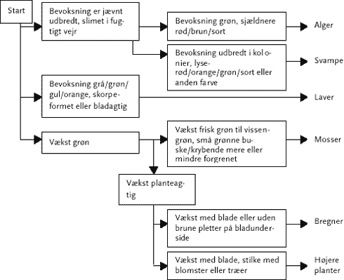 Renere teknologi til undgåelse af biologisk vækst på murværk, tegl- og betontage 7 Biologisk vækstTil "Katalog over biologisk vækst på murværk og tegl" er der udarbejdet to nøgler som redskab til at bestemme, hvilke organismer der vokser på en given prøve fra mur, tegl og beton. I Nøgle I kan man bestemme, hvilken biologisk klasse væksten tilhører. I Nøgle II kan man bestemme laver, mosser og alger til slægt eller art. Det skal dog bemærkes, at materialet, som danner grundlag for bestemmelsesnøglerne, ikke kan regnes for udtømmende for danske forhold, og at der derfor vil kunne findes arter som ikke er beskrevet her. Højere planter og såkaldte sporeplanter kan som tidligere nævnt vokse på de materialer projektet omhandler. Nedenfor er derfor gengivet katalogets nøgle til overordnet klassificering af den biologiske vækst med beskrivelser af de enkelte typer af vækst. Nøglen er opbygget sådan at man med væksten i hånden skal svare på spørgsmålene i rækkefølge og gå videre til det næste punkt, indtil man finder det rigtige svar. Hvert punkt har to spørgsmål. 7.1 Nøgle I - overordnet bestemmelse af biologisk vækst