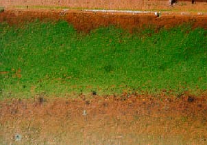 Figur 7.1 7.1.1 Bakterier (ikke medtaget i nøgle og ikke illustreret)Bakterier omfatter ca. 1700 arter fordelt på godt 100 slægter. De optræder overalt: i jord, vand og luft samt i og på mennesker, dyr og planter. På grund af deres ringe størrelse spredes de let gennem luften. Ofte findes de i store mængder - en frugtbar jord kan indeholde ca. 1 milliard celler pr. g jord heraf er dog max 10% af bakterierne levende. Bakterierne kan leve enkeltvis eller samle sig i kolonier eller danne film henover en overflade. Ifølge litteraturen kan der vokse bakterier på tag- og murflader, som muligvis kan danne næring for andre organismer. Bakteriebelægninger er ikke synlige. 7.1.2 AlgerOrdet alger anvendes om en række forskellige organismer, der er meget forskellige i udseende og levevis. De fleste kender alger som tang, der driver ind på stranden eller "vandblomster" på søerne. Det kan være store flercellede organismer eller encellede organismer beslægtet med bakterier, andre har fællestræk med svampe og atter andre må formodes at være stamform til højere planter. Algerne udfører fotosyntese ved hjælp af chlorofyl. Vi kender alger som knyttet til vandmiljøet, men nogle mikroskopiske alger optræder i og på jord, mens andre lever som luftalger, f.eks. på fugtige klipper og træstammer. Det er disse luftalger, der kan etablere sig på tage og facader under særlige forhold. Algerne omfatter 25.000 arter fordelt på 2000 forskellige slægter. Nogle alger kan tåle ekstreme forhold og variation i temperatur, fugtighed osv. Alger på tag- og murflader vil ofte tilhøre gruppen af grønalger og danne udbredte grønne belægninger. Algebelægninger kan dog også være rødlige til brunsorte og tilhører da gruppen af rødalger.