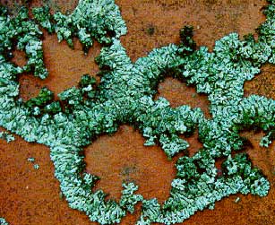 Figur 7.3 7.1.4 LaverLaver er betegnelsen for en symbiose (eller samliv) mellem en svamp og en alge, hvor algen laver fotosyntese, og svampen opsuger vand og næring fra substratet og den omgivende luft. Algen er omsluttet af svampen, så den undgår udtørring. Laver kan være skorpeformede, bladformede eller buskformede. Hos skorpelaverne er hele organismen fast tilhæftet substratet, og er næsten umulige at fjerne. Bladlaverne sidder fast på underlaget med en slags hæftetråde (rhiziner) og er vanskelige at fjerne. Busklaver er mere løst tilhæftet underlaget på et meget lille område af undersiden. Laverne opsuger vand og næring med hele deres overflade, og svampen udnytter selv disse stoffer eller bringer dem ind til algerne for videre bearbejdning. Mange laver kan klare sig med at leve af partikler i luften alene. Den regn og det støv, som kommer til laverne via luften, er tilstrækkelig til at de kan trives. Til gengæld er de stærkt følsomme overfor forurening og kan bruges som artsindikatorer for graden af luftforurening i et givent område. Laverne kan tåle udtørring gennem lange perioder. En udtørret lav befinder sig i en dvaletilstand. Laverne vokser uhyre langsomt, men kan til gengæld leve meget længe. Blad- og skorpelaver vokser radiært ud men ofte ikke mere end 0,5-2 mm pr år. Laverne udskiller organiske syrer og andre stoffer.