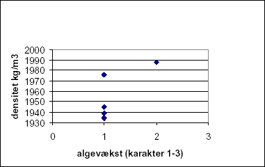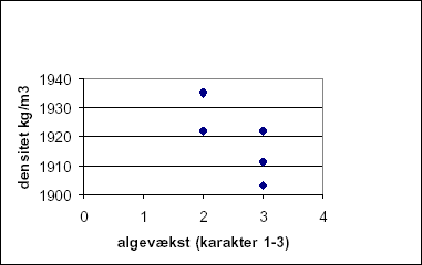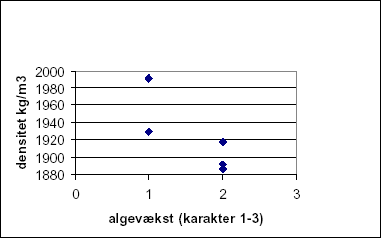 * k.i.b.: kan ikke bestemmes. Porøsiteten, udtrykt ved vandcementforholdet (v/c), har kun kunnet vurderes på én sten. Der ses her ingen forskel i v/c i områder med vækst og områder uden. Porøsiteten, udtrykt ved indholdet af luftporer, synes ikke at have indflydelse på forekomst af vækst. Hvor der forekommer vækst ses nedtrængning i porer meget tæt på overfladen (0,5 mm fra denne). På malede overflader ses hovedsagelig vækst, hvor malingen er nedbrudt/gennembrudt. I disse områder ses nedtrængning langs sten tæt på overfladen. Det er ikke muligt at afgøre, om det er væksterne der gennembryder malingen eller om de trænger ned, hvor malingen i forvejen er gennembrudt. Det kan dog ikke udelukkes at væksten kan medvirke til nedbrydning af malingslag, hvor underliggende porøsiteter giver svagheder i malingen. 8.3.1 Litteraturens oplysninger om betydning af porøsitetPå Gordon University i Aberdeen er der lavet en række undersøgelser af biologisk vækst på sandsten. I følge [31] er der 2 typer af porøsitet der har betydning for forekomsten af biologisk vækst. Dels den totale effektive porevolumen, som bestemmer mængden af vand der kan tilbageholdes af sandstenen og dels fordelingen af porestørrelser, som bestemmer tilgængeligheden af vandet og den plads der er tilgængelig inde i materialet til vækst. Størrelsen af organismen afgør en mindste grænse for hvilke porestørrelser væksten kan gro i. Generelt gælder det, at porestørrelse mindre end 10 µm kun er tilgængelige for bakterievækst. Alger findes dog ofte på sandstenenes overflade, og overfladevæksten er kun påvirket af porøsiteten i den udstrækning det influerer på tilgængeligheden af fugt og overfladeruheden. Alger kan dog også forekomme under overfladen. Hvor dybt fotosyntetiserende vækster kan forekomme afhænger af lysets gennemtrængelighed. Således har porestørrelsesfordelingen stor indflydelse på de organismer der kan kolonisere materialet under overfladen. 8.4 DensitetEn evt. relation mellem vandoptagelse og algevækst er undersøgt for 20 sten udtaget fra 4 tagflader fra samme boligforening. Tagstenene er gule vingetegltagsten. Omfanget af algevækst på stenens oversider blev bedømt efter skalalen 0-1-2-3. Hvor 0 er ingen algevækst. Resultaterne fremgår af følgende 4 figurer:
