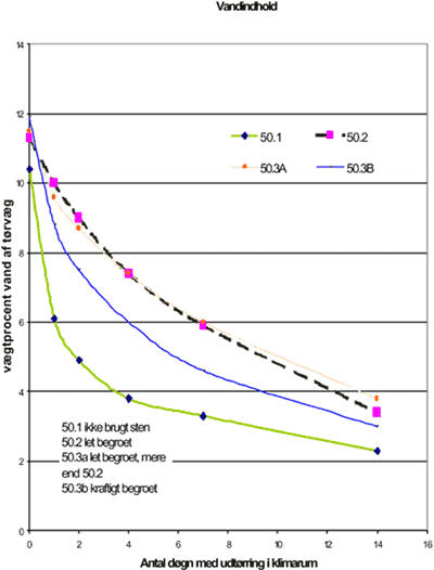 Figur 8.11: Ved sammenligning af udtørringshastigheder er det porernes mætning af vand/relative fugtighed der er den egentlige interessante parameter. Er materialernes sorptionsisoterm bestemt, kan det totale vandindhold i vægtprocent af materialets tørvægt dog være en lige så beskrivende parameter. I de efterfølgende sammenligninger af vandindholdet (%) er sammenligningerne derfor kun udført for materialer, som må antages at have samme sorptionsisoterm/ligevægtsfugtkurve. Der kan f.eks. kun sammenlignes tegl fra samme tag og med tilsvarende sammensætning/brænding. 8.7.3 Konkrete målinger af fordampningshastighedPå en række tagsten med biologisk vækst er fordampningshastigheden bestemt. Metoden er beskrevet i afsnit 6.4. Fordampning fra tegltagsten Prøve 50.1, 50.2 og 50.3 er en orienterende undersøgelse af ændringen af fordampningshastighed, idet 50.1 er en ubrugt sten, 50.2 en let begroet sten og 50.3 en moderat begroet sten fra samme tagflade. Følgende figur 8.12 viser forskellen i fordampningshastighed mellem en ny ubrugt sten, 2 let begroede sten (50.3a vurderes lidt mere begroet end 50.2), og en mere kraftigt begroet sten: