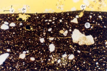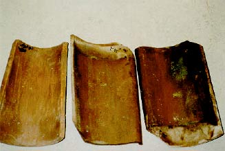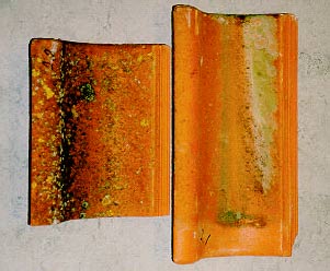 På baggrund af undersøgelserne beskrevet i det følgende vurderes ruheder i overfladen at have betydende indflydelse på mulighederne for forekomst af vækst Ligeledes har ruheden en stor indflydelse på arten af vækst der kan forekomme idet de forskellige arter stiller forskellige krav til vedhæftningsmuligheder. Algebevoksning på tegltag Et 5 år gammel tegltag er undersøgt, efter at det på et relativt tidligt tidspunkt var konstateret, at en del af tagteglene var misfarvet af algevækst. Stenene er røde tegltagsten. Det kunne iagttages, at hovedparten af teglstenene var begroede. De ikke begroede områder var skarpt afgrænsede og svarede til de arealer som kunne dækkes med tagsten fra en eller flere af de leverede partier/paller. Der kunne ikke konstateres sammenhæng mellem bygningens orientering mod verdenshjørner og forekomst af vækst. Fra 3 teglsten med forskellig bevoksningsgrad blev der fremstillet i alt 9 tyndslib, et i bund og et fra en vinge på hver sten. Mikroanalysen viste følgende: Prøverne er ens sammensat. Magringskornene er overvejende kvarts. Der er enkelte store magringskorn og sorte partikler. Omkring disse ses vedhæftningsrevner. Der er få luftporer <1mm. Porøsiteten er homogen og ret ens i de 9 tyndslib. I alle prøver ses enkelte overfladeparallelle revner, 2-7 mm, i midten af teglstenene. Der er ingen sammenhæng mellem forekomst af revner og algebevoksning. Overfladerne adskiller sig fra hinanden på mikroniveau. Overfladen uden begroning er meget jævn, men overfladen med begroning er mere ru. Algevækst ses især i bunden af disse ujævnheder. Øvrige tyndslibsundersøgelser Tabel 8.12: