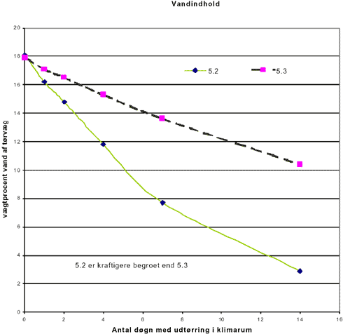 Figur 8.22 viser forskellen på fordampningshastighed af 2 betontagsten med forskellig grad af begroning (primært laver). 2.2 er kraftigere bevokset end 2.1
