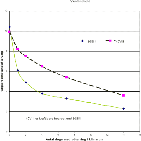 Figur 8.15: Igen ses hurtigst vandfordampning fra sten med mest vækst. Figur 8.16 viser forskellen på fordampning fra 2 gule tegltagsten med lavvækst. 40VIII er kraftigere begroet end 30SIII.