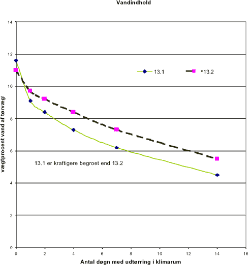 Figur 8.17: Igen ses hurtigst vandfordampning fra sten med mest vækst. Figur 8.18 viser forskellen i fordampning mellem 2 røde tegltagsten. 13.1 er kraftigere begroet end 13.2.