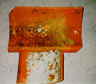 Figur 8.28: 8.9.1 Litteraturens oplysninger om betydning af overfladeruhedOgså ifølge [1] har overfladens ruhed en betydning for muligheden for algevækst. Der henvises til en artikel af Young en Urquhart (1996) hvori den specifikke effekt af ruheden er undersøgt, men dog ikke kunne bekræftes. I artiklen af Zanger [23] gives der udtryk for, at ruhed har en betydning for forekomst af biologisk vækst. Glattere overflader kan forsinke vækst, men ikke nødvendigvis sikre, at det aldrig kommer. I modsætning til disse undersøgelser mener [20] at materialernes overfladeruhed er af underordnet betydning for forekomst af biologisk vækst. I [19] refereres til en artikel af Brightman (1965) hvori, der konkluderes at vandoptagelse, pH og overfladeruhed har betydning for lavvækst. 8.10 Overfladespændings indflydelseRegnvandet og materialets overfladespænding kan evt. have indflydelse på fremkomsten af biologisk vækst, idet befugtningen af overfladen afhænger af materialernes overfladespænding. Det at befugte en overflade er ikke ensbetydende med at væsken også trænger ind i materialet. Overfladespænding er ikke en parameter der er undersøgt nærmere i indeværende projektforløb, men projektgruppen har gjort følgende overvejelser: Rent vand har en overfladespænding på ca. 73 dyn/cm ved 20°C. Det er denne spænding der holder væsken sammen i dråber og hindrer den i at trænge ind i eller glide af overflader. Vands høje overfladespænding bevirker, at vanddråber kan blive betydelig større end dråber af f.eks. alkohol eller ether. Overfladespændingen i vand falder med stigende temperatur. Ved 0°C er overfladespændingen 76 dyn/cm, ved 20°C er den 73 dyn/cm og ved 100°C, er den 59 dyn/cm. Har regnvandet en højere overfladespænding end materialets (overflade) opstår der ingen befugtning af overfladen, idet vandet, afhængig af overfladens hældning, perler af eller bliver stående i små kugler. Dette er eksempelvis tilfældet med vand på en epoxybehandlet overflade (Epoxy har en overfladespænding på 39 dyn/cm). Hvorvidt overfladespændingen på rent vand er væsentlig forskellig fra regnvand vides ikke. Sur regn vurderes ikke at afvige væsentligt fra rent vand på grund af svovlindholdet. Svovlsyre har en overfladespænding, der ikke afviger væsentligt fra vand (2-3 dyn/cm højere), selv i høje koncentrationer. I lave koncentrationer er ændringen ikke af afgørende betydning. Det, at der ofte går et stykke tid, før der kan konstateres biologisk vækst på en overflade, kunne måske henføres til en ændring af materialets overfladespænding. Når overfladen er ny og intakt har den måske en overfladespænding der er lige under vandets. Vandet perler dermed af, men efterhånden som overfladen slibes af sandpartikler indeholdt i luft og vand, der påvirker overfladen, øges overfladespændingen. Slibningen kunne også tænkes at føre til at vandet "narres" til at befugte overfladen, selv om materialets overfladespænding egentlig er for lav, idet slibningen bl.a. giver en større virkelig overflade end den projicerede. Det betyder at overfladen besidder mere fri overfladeenergi pr cm2, hvilket kan "narre" vandet til at befugte overfladen. Befugtningen giver måske mulighed for udvikling af en svag/usynlig biofilm/ Set ud fra en befugtningssynsvinkel kan et fast/flydende stof befugte andre, som har en højere overfladespænding end det selv. Regnvand vil således være i stand til at befugte materialer som glas, stål, aluminium, beton og tegl, (for beton og tegl afhængig af overflade ruheden), men ikke overflader af f.eks. epoxy, polyurethan, nylon, PVC og Teflon. Litteratur vedr. overfladespændings betydning for vækst Botaniker, prof. Wilhelm Barthlott, Universität Bonn har forsket i sammenspillet mellem overfladekemi, mikrostruktur og materialers tilbøjelighed til at tilsmudse og blive begroet med biologisk vækst. Der er indgået et patent vedr. en såkaldt selvrensende "Lotuseffekt" og et samarbejde med industrien er igangsat. Dette har bl.a. resulteret i udviklingen af en mikrosilikoneharpiksfarve og en tegltagsten der efter sigende skulle have en selvrensende effekt. Princippet bygger på, at produkterne pga. en hydrofobiering i kombination med en særlig overflademikrostruktur skulle have en overfladespænding der afviser vandpartikler og at smuds og vækst dermed ikke skulle få mulighed for at fæste. [3];[4] Princippet og de specifikke produkter er ikke undersøgt i indeværende projekt.