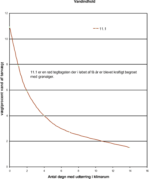 Figur 8.19: Igen ses hurtigst vandfordampning fra sten med mest vækst. Figur 8.20 viser fordampningshastigheden af en rød tegltagsten, som er blevet kraftigt bevokset med alger i løbet af få år.
