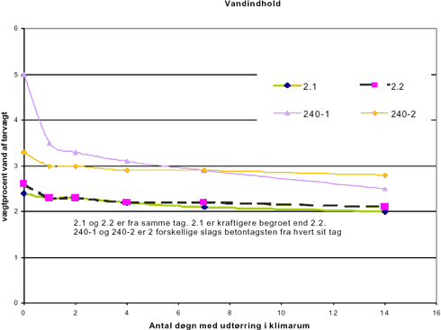 Der ses dog en markant hurtigere fordampning fra den ældste sten med kraftigst begroning. Tyndslibsundersøgelserne har vist en let sur påvirkning af 240-1s overflade (sur regn). Dette må forventes at være medvirkende til hurtigere fordampning 8.7.4 Kommentering af resultater vedr. fordampningshastighedFølgende skema viser en oversigt over startvandindholdet og slutvandindholdet efter 14 dages tørring i klimarun v. 20°C, 65% RH. Tabel 8.10: