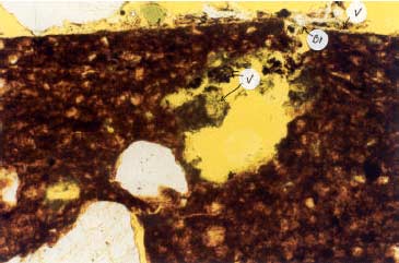 For prøverne 11.1, 51.1, 60.1 og 61.1 gælder det, at der i løbet af en kort periode er kommet relativt kraftig grønalge vækst. For 11.1, 60.1 og 61.1 gælder det, at der er et relativt lavt pH i overfladen og at det er lavere end tværsnitsprøven (pH i overfladen <8). 51.1 afviger herfra, idet pH både i overflade og tværsnit er 8,7. 51.1 er den yngste af de nævnte sten. Hvis pH-ændring i overflade tilskrives udvaskning af vandopløselige calciumforbindelser kan alderen måske forklare at der ikke er forskel på overflade-pH og tværsnits-pH. Der ses svag tendens til at teglmaterialer med et relativt lavt pH i overfladen hurtigere vokser til med grønalger end teglmaterialer med et højere pH. Dette kan dog langt fra konkluderes med sikkerhed og bør undersøges nærmere. Mere sandsynligt er det måske, at materialer med et lidt højere pH er mere tilbøjelige til at blive bevokset med de mere langsomt voksende laver der med tiden overtager som den dominerende vækst og fortrænger grønalgerne. Grønalgerne har på ingen af de i projektet udtagne betonprøver været den dominerende vækst. For beton synes der ligeledes at være en svag tendens til at grønalgerne kun kommer i områder der er karbonatiseret, så pH er kommet ned under ca. 9, mens laverne også her trives i højere pH. Laver Der ses en tendens til at laverne foretrækker et basisk pH. Der ses en tendens til at pH skal være højere end 9 (ved måling på prøve udtaget fra tværsnit) for at lavarterne er den dominerende vækst. 8.2.1 Litteraturens og andre oplysninger om betydning af pHDet er kendt fra mange sammenhænge, at pH har en stor effekt på floraens sammensætning. Man taler om acidophile, neutrophile og basiphile arter. Acidophile arter foretrækker et vækstmedium med lavt pH, neutrophile et neutralt pH og basiphile et vækstmedium med højt pH. Basiphile arter omtales ofte som de kalkelskende arter. I følge [1] foretrækker alger på byggematerialer et let alkalisk miljø. I [19] refereres til en artikel af Brightman (1965) hvori, der konkluderes, at vandoptagelse, pH og overfladeruhed har betydning for lavvækst. Ældre danske branchefolk oplyser, at man tidligere af og til behandlede tegltagsten med kalkvand for at forebygge algevækst. Behandling med kalkvand vil hæve pH. 8.3 PorøsitetMaterialernes porøsitet er undersøgt på udvalgte prøver ved mikroanalyse af tyndslib. Tegl Fra hver af de udvalgte teglsten blev valgt at fremstille et tyndslib fra område med kraftig vækst og et område med ingen/ringe vækst. Dette valg medførte, at tyndslib fra område med kraftig vækst måtte placeres i bund af sten og tyndslib med ingen/ringe vækst placeres i top (vinge). På prøve 30SIII er begge tyndslib dog placeret i bund. Det ene hen over en delaminering, det andet i visuelt intakt område. Tabel 8.4:
