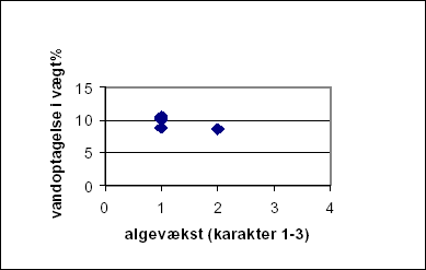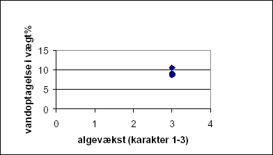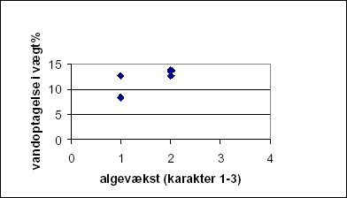 Der er ingen litteraturoplysninger fundet vedr. betydningen af materialernes densitet for forekomst af vækst. 8.5 Vandoptagelse og minutsugningEn evt. relation mellem vandoptagelse og algevækst er undersøgt for 20 sten udtaget fra 4 tagflader fra samme boligforening. Tagstenene er gule vingeteglsten. Omfanget af algevækst på stenens oversider blev bedømt efter skalalen 0-1-2-3. Hvor 0 er ingen algevækst. Resultaterne fremgår af følgende figurer (vandoptagelsen i vægt%):