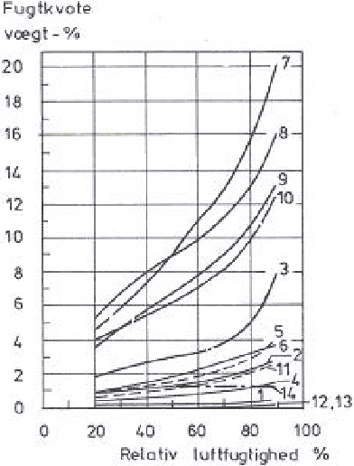 8.5.1 Litteraturens oplysninger om betydning af vandoptagelseI undersøgelse udført af Institut für Ziegelforschung Essen e.V. [20] har der indgået materialer med både meget lav og meget høj vandoptagelse. Undersøgelsen blev gennemført som et fritlandsforsøg, hvor prøver over længere tid blev udsat i fri luft og løbende vurderet med hensyn til biologisk vækst. Materialernes vandoptagelse blev ikke separat vurderet at være en parameter der isoleret set er betydende. Det konkluderes, at "alle forholdsregler, der nedsætter tagets fugtighedsindhold, bidrager til at hindre mos og algedannelse". Alt i alt vurderes reduktionen af middel fugtigheden af et tegltag at være den vigtigste forholdsregel til forhindring af algedannelse og mosdannelse. I [19] refereres til en artikel af Brightman (1965) hvori, der konkluderes at vandoptagelse, pH og overfladeruhed har betydning for lavvækst. 8.6 MinutsugningDet har i projektforløbet ikke været muligt at få lov til at udtage tilstrækkeligt med bevoksede mursten til at en vurdering af minutsugets evt. betydning for vækst har været mulig. Der er heller ikke i litteraturen fundet oplysninger om minutsugets specifikke betydning. Reduktion af minutsug vil dog ved kortvarig vandpåvirkning medvirke til at nedsætte vandoptagelsen og dermed reducere fugtindholdet. Stens minutsug vil efter ibrugtagning ændres i forhold til produktionsnye sten pga. udfældninger på overfladen, tilsmudsning mv. 8.7 Fordampningshastighed8.7.1 IndledningFor tegltagsten er det et velkendt fænomen, at evnen til at afvise vand først indtræder en vis periode efter oplægning. Denne ændring af stenen må forventes også at kunne have en indflydelse på vandets fordampningshastighed fra stenene. Derfor kan man ikke umiddelbart, udfra undersøgelser af nye sten, afrapportere den reelle vandfordampningshastighed efter oplægning. For en betontagsten må det også formodes at fordampningshastigheden ændres, efterhånden som carbonatisering indtræder og nedbrydning af evt. malingslag med tiden finder sted. I det følgende er der gennemført en sammenligning af parvis sammenhørende sten med forskellig grad af biologisk vækst. Resultaterne kan ikke anvendes til at vurdere, om fordampningshastigheden fra nyoplagte sten har indflydelse på, hvor hurtigt der kommer biologisk vækst. Resultaterne kan alene anvendes til at vurdere, om fordampningshastigheden er påvirket af øget vækst. 8.7.2 SorptionsisotermerPorøse materialer indeholder vand, selv når de umiddelbart forekommer at være tørre. Vandindholdet afhænger af den omgivende lufts relative fugtighed og materialets porestruktur. Porøse materialer vil optage eller afgive fugt, indtil de når en ligevægtstilstand med den omgivende lufts fugtindhold. Kurver der viser materialers vandindhold i ligevægt med luft af forskellig fugtighed kaldes fugtligevægtskurver eller sorptionsisotermer. Et materiales vandindhold angiver vægten af det optagne vand i procent af materialets tørvægt. I mange tilfælde kan materialer komme til at indeholde væsentligt mere vand, end hvis de var i ligevægtstilstand med den omgivende lufts fugtighed. Det kan skyldes nedbør og kondensation. Udtørring bringer vandindholdet ned mod ligevægtstilstanden med den omgivende luft. Den hastighed, hvormed udtørring kan ske, afhænger af den omgivende lufts temperatur og fugtindhold og dermed af udluftningen. Den drivende kraft ved udtørringen er forskellen mellem vanddampindholdet i den omgivende luft og i luften inde i materialernes porer. Følgende figur 8.9 viser eksempler på sorptionsisotermer for en række forskellige byggematerialer.