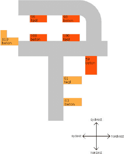 9.3 BeskrivelseDet udvalgte område er i et lokalt parcelhuskvarter syd for Århus i nærheden af Teknologisk Institut, Murværk. Undersøgelserne omfattede 7 parcelhuse, hvoraf 4 har betontag og 3 har tegltag. Samtlige huses ydermur er blankt teglstensmurværk. Husene er placeret geografisk i forhold til hinanden som angivet på nedenstående figur 9.1: