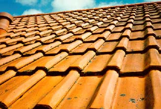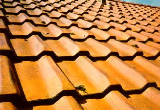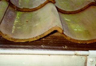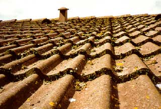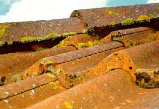 Figur 9.4: På tegltagene ses primært en tynd algefilm, lidt mos i overlap og enkelte steder spredte lavpuder som vurderes at være Physcia caesia (sølvgrå lav).