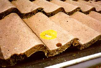 Figur 9.12: 9.5.6 Betydning af tidligere afrensning2 af tagfladerne er tidligere renset med højtryksrenser. Husejerne oplyste, at tagene havde været relativt rene i ca. 3 år. Tagfladerne er atter relativt kraftigt bevokset. Dog er de enkelte lavpuders omkreds ikke så store, hvilket nok blot viser at laverne ikke er så gamle som på de uafrensede tage. På rygningsstenene ses dog større puder af især den orange lav Xanthoria parietina. Der er mange mindre laver. Dette kan indikere, at afrensning evt. kan medføre spredning af lavernes spredningsenheder og ved øget ruhed i overfladen på stenene give basis for øget ny vækst.