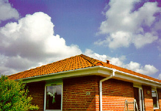 Figur 9.1 Husene er opført indenfor en kort årrække, således at husene er fra 16-20 år gamle. 9.4 RegistreringerSkemaer over registreringer fra områdeundersøgelser findes i bilag 1. Registreringerne er udført delvis af Teknologisk Institut, delvis af husejerne. Kun fra 1 tag har det været muligt at udtage en tagstensprøve. Dennes vækst er identificeret i lab. De øvrige tages vækst er identificeret udfra skrab af vækst, sammenligning med udtagne prøve og brug af farvekataloget. 9.5 Observationer9.5.1 Betontage/tegltageDer ses generelt væsentligt mere vækst på betontagene. Særligt er der mere lavvækst, hvor især den orange lav Xanthoria parietina er iøjnefaldende på betontagene. På betontagene er det lav og mosvækst der dominerer. Tegltagene i det undersøgte område er generelt ikke kraftigt bevokset. I projektforløbet er der andre steder set tegltage med væsentlige mere vækst.