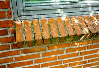 Figur 9.5: 9.5.2 MurværkSamtlige huse har et tagudhæng, og generelt er der ikke væsentlig vækst på det lodrette murværk. Enkelte steder er der lidt mosvækst i fuger. Typisk på områder hvor der har været lavere buskbevoksning nær op af muren. Flere steder ses der lav og algevækst på sålbænke. Men generelt synes tagudhænget at forebygge væsentlig vækst på murværket.