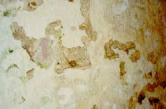Figur 11.1: Figur 11.2 viser en kirkes udvendige kalkede murværk, hvor der på alle facader i større eller mindre omfang var sket afskalninger fra kalklaget. Ved at skrabe kalk fra overfladerne blev det konstateret, at der i stort omfang voksede alger under de yderste kalklag og nogle steder voksede der også mos. I forbindelse med undersøgelserne blev der konstateret tegn på tidligere lag der har indeholdt maling. Denne kan medvirke til dårlig vedhæftning. Algelagene er dog i det aktuelle tilfælde også vurderet at være en medvirkende årsag til afskalningerne.
