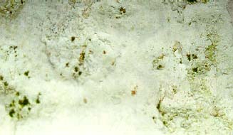 Figur 11.2: 11.6 Misfarvninger/Ændret æstetisk udseendeGenerelt Om vækst opfattes som en misfarvning eller en uønsket ændring af konstruktionens æstetiske udseende er en meget subjektiv vurdering. Teglværker har oplevet, at kunder generelt klager, hvis røde tegltagsten i løbet af mindre end ca. 3 år bliver kraftigt begroet med grønalger. Alger eller svampevækst på malede facader bliver også af de fleste opfattet som uønskede misfarvninger som ønskes undgået eller fjernet. Projektresultater Indeværende projekt har kun i mindre omfang omhandlet svampe. En række skimmelsvampe er dog kendt for at kunne forårsage misfarvning på facader, især på pudsede overflader med eller uden maling. At skimmelsvampene er talrige og til stede blev dog bekræftet ved et forsøg udført i fase 3, hvor vi anvendte en metode, som bruges til undersøgelse af skimmelsvampe indendørs i bygninger til at undersøge bevoksninger af laver på sålbænke før og efter afrensning. Her fik vi ikke overraskende et meget stort antal skimmelsvampe, men vi kan ikke sige, at det var disse skimmelsvampe, der gav et visuelt indtryk af en kraftig bevoksning. Det var så udpræget lavvæksten. På enkelte prøver af puds med og uden maling og på en kalksandsten som var tydelig misfarvet har vi konstateret vækst af Cladosporium og Alternaria. På baggrund af mikroanalyse af tyndslib af malede betontagsten kan det ikke udelukkes, at vækst i nogle tilfælde kan medvirke til nedbrydning af malingslag der hvor underliggende porøsitet giver svagheder i malingen. Det formodes dog, at denne nedbrydning er meget langsom og sjældent vil være den udslagsgivende årsag til afrensning og nymaling. Teknologisk Institut, Murværk har for en årrække siden udført en orienterende undersøgelse af 6 grønglaserede teglsten. Undersøgelsen blev gennemført med henblik på at vurdere årsagen til at tagstenene med tiden havde ændret udseende. Glasurens oprindelige grønne farve var i visse områder blevet mere brun. Tagstenen var dækket af biologisk vækst. Et orienterende laboratorieforsøg viste, at oxalsyre kunne reagere med glasuren og danne lignende misfarvninger. Den biologiske væksts udskillelse af oxalsyre blev mistænkt for at være medvirkende til dannelse af misfarvningerne. Konklusionerne blev dog opstillet på grundlag af relativt simple undersøgelser. En eftervisning vil kræve mere dybdegående undersøgelser af væksttype, glasursammensætning og reaktionslagenes sammensætning.