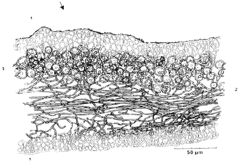 Hvis der er alger i randen af apotheciet, kaldes det en thallusrand (2). Den del af randen, hvor der ikke er alger kaldes egenrand. Areoleret: Mosaikdannende, det skorpeformede thallus sprækker. Blastidier: Afsnøringer af små afrundede knopper fra thallus. Cilier: Trådagtige udvækster fra randen af thallus. Endolithisk: Organismen vokser ind i stensubstratet. Epilithisk: Organismen vokser oven på stensubstratet. Epitheciet: Den øverste del af hymeniet. Hypotheciet: Laget under hymeniet og det reproduktive lag. Involucrellum: Et væv der dækker det øverste af nogle perithecier, er adskilt fra men omgiver randen. Isidier: En udsvækst af lavens barklag, der indeholder alger. Leprøs: Thallus overfladen er helt kornet af spredningsenheder kaldet "soredier", har selv i unge stadier intet barklag. Lober: "Tunger" i thallus. Perithecier: Frugtlegeme der er flaskeformet. Hymeniet sidder beskyttet i centrum af "flasken". Polært tocellet: tocellede sporer med en ± tyk væg, hvor de to celler stadig har forbindelse gennem en smal kanal. Prothallus: det første stadie i dannelsen af et thallus, en hyfestruktur uden alger. Pruina: et rimfrost- eller flormelislignende lag, der kan findes på apothecier og thallus. Pruinøs: Med pruina. Rhiziner: Hyfestrenge der holder laven fast til substratet. Siddende: Har ingen stilk, sidder på overfladen af thallus. Soraler: Barkløse områder af thallus, hvor der forekommer en hyppig deling af algecellerne og som danner små pakker af algeceller + svampehyfer (soredier) Soredier: Spredningsenhed, se soraler. Thallus: Lavens vegetative del. Barklaget (1) er en tæt stuktur af hyfer, beskytter marven (2) som er et løsere opbygget hyfelag for udtørring og direkte UV-bestråling. hvori algerne (3) ligger beskyttet