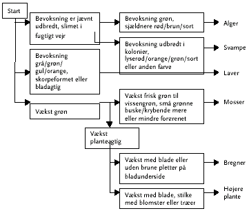 Renere teknologi til undgåelse af biologisk vækst på murværk, tegl- og betontage 7 Biologisk vækstTil "Katalog over biologisk vækst på murværk og tegl" er der udarbejdet to nøgler som redskab til at bestemme, hvilke organismer der vokser på en given prøve fra mur, tegl og beton. I Nøgle I kan man bestemme, hvilken biologisk klasse væksten tilhører. I Nøgle II kan man bestemme laver, mosser og alger til slægt eller art. Det skal dog bemærkes, at materialet, som danner grundlag for bestemmelsesnøglerne, ikke kan regnes for udtømmende for danske forhold, og at der derfor vil kunne findes arter som ikke er beskrevet her. Højere planter og såkaldte sporeplanter kan som tidligere nævnt vokse på de materialer projektet omhandler. Nedenfor er derfor gengivet katalogets nøgle til overordnet klassificering af den biologiske vækst med beskrivelser af de enkelte typer af vækst. Nøglen er opbygget sådan at man med væksten i hånden skal svare på spørgsmålene i rækkefølge og gå videre til det næste punkt, indtil man finder det rigtige svar. Hvert punkt har to spørgsmål. 7.1 Nøgle I - overordnet bestemmelse af biologisk vækst
