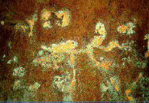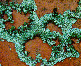 Figur 7.3: Laver er betegnelsen for en symbiose (eller samliv) mellem en svamp og en alge, hvor algen laver fotosyntese, og svampen opsuger vand og næring fra substratet og den omgivende luft. Algen er omsluttet af svampen, så den undgår udtørring. Laver kan være skorpeformede, bladformede eller buskformede. Hos skorpelaverne er hele organismen fast tilhæftet substratet, og er næsten umulige at fjerne. Bladlaverne sidder fast på underlaget med en slags hæftetråde (rhiziner) og er vanskelige at fjerne. Busklaver er mere løst tilhæftet underlaget på et meget lille område af undersiden. Laverne opsuger vand og næring med hele deres overflade, og svampen udnytter selv disse stoffer eller bringer dem ind til algerne for videre bearbejdning. Mange laver kan klare sig med at leve af partikler i luften alene. Den regn og det støv, som kommer til laverne via luften, er tilstrækkelig til at de kan trives. Til gengæld er de stærkt følsomme overfor forurening og kan bruges som artsindikatorer for graden af luftforurening i et givent område. Laverne kan tåle udtørring gennem lange perioder. En udtørret lav befinder sig i en dvaletilstand. Laverne vokser uhyre langsomt, men kan til gengæld leve meget længe. Blad- og skorpelaver vokser radiært ud men ofte ikke mere end 0,5-2 mm pr år. Laverne udskiller organiske syrer og andre stoffer.