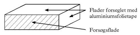 8.6 FordampningshastighedFordampningshastighed bestemmes på Teknologisk Institut, Murværk ved en metode der ofte anvendes til at sammenligne fordampningshastighed mellem ubehandlede og overfladebehandlede teglsten. Metoden gennemføres på følgende vis: Prøvelegemet tørres til konstant vægt i tørreskab med strømmende luft ved 40±5°C Herefter forsegles prøvelegemets liggeflader og kopender, således at kun prøvelegemets overfladebehandlede løberside og ubehandlede løberside er frie. Prøvelegemet vejes og lagres derefter 3 døgn helt nedsænket i vand. Efter vandlagringen vejes prøvelegemet atter, og dets bagside (den ubehandlede løberside) dækkes med plastfolie og på en sådan måde, at fordampning af vand kun kan ske gennem prøvelegemets overfladebehandlede løberside (se fig. 1).