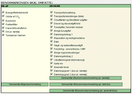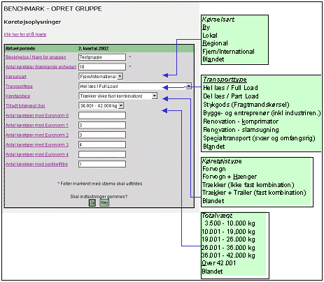 Denne opdeling ligger tæt op ad branchens egen opfattelse af skillelinierne mellem virksomhedernes forretningsområder. For virksomheder, der ikke har et fast forretningsområde, er der i alle klasser indført muligheden for at vælge "blandet". Der er på trods af denne reduktion stadig mulighed for 1.400 forskellige virksomhedsprofiler, hvoraf en stor del dog ikke er realistiske. Man forventer f.eks. ingen grupper med profilen: by, specialtransport, forvogn, over 42.001 kg. Selve angivelsen af gruppe sker som første trin efter registreringen af den enkelte virksomhed som bruger på systemet. Gruppe er ikke en statisk størrelse, men en måde at organisere data på der skaber overblik og reducerer brugernes inddatabelastning. Når der købes nye lastbiler, kan de indgå i en bestående gruppe og ændrer dermed gruppens resultater for bl.a. gennemsnitlig Euronorm. Tidligere kvartalers resultater påvirkes ikke af ændringer i gruppen, de er fortsat beregnet med gruppens daværende sammensætning og opgjort pr. km, time og køretøj. Ligeledes hvis der frasælges lastbiler, eller hvis de overgår til en anden gruppe inden for virksomheden. På den måde er det sikret, at sammenligninger af nøgletal over tid er mulig. 3.4 Krav til miljø-benchmarkingDer var fra starten ønske om, at systemet kunne dække alle relevante miljøfaktorer og dermed bruges til komplet dokumentation for transportens miljøbelastning. Efter en nøjere gennemgang af de styrende elementer i dannelsen af bl.a. NOx og partikler blev det klart, at disse ud over motorens EURO-norm og dieselforbrug i høj grad afhang af belastningen af motoren. Der ville således være brug for angivelse af, hvor mange km der var kørt med forskellig belastning pr. lastbil for at få et korrekt resultat. En så specifik angivelse vil kun give udbytte til få brugere og betyde ulemper for mange, hvorfor denne mulighed blev fravalgt. De brugere, der ønsker at opgøre udslip af NOx, CO, HC og partikler til brug for grønne regnskaber eller dokumentation til kunder, henvises derfor til beregningsmodellen "Beregn miljødata" på http://www.transit.dkhvorfra det er muligt at beregne og printe emissionsdata for lastbiltransport. I www.benchmarks.dk opgøres følgende forhold af betydningen for miljøet: