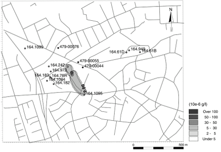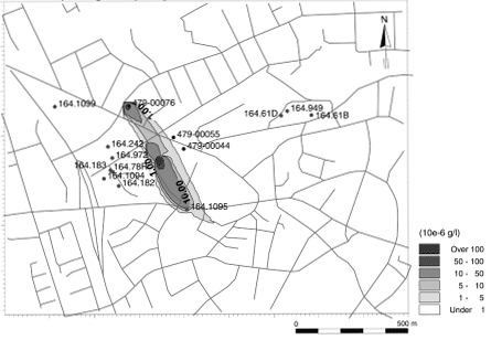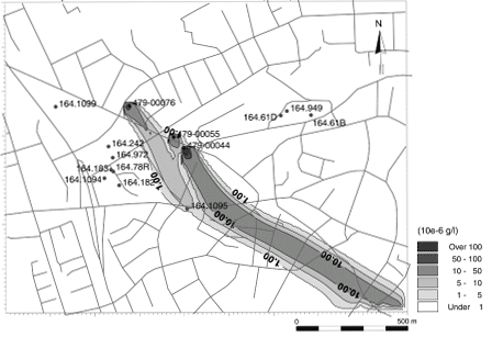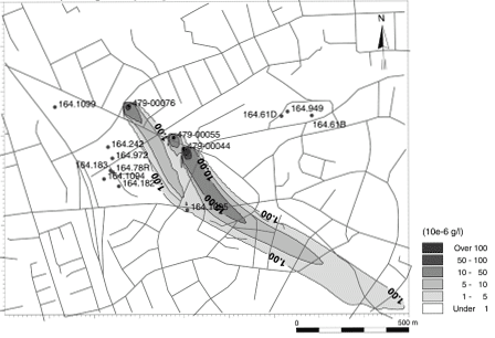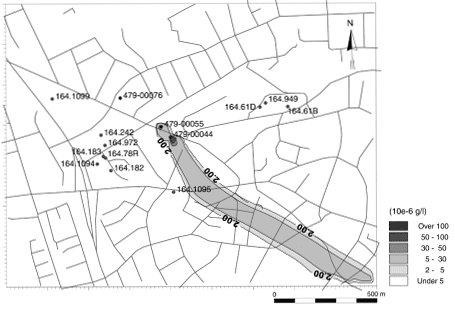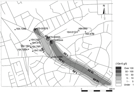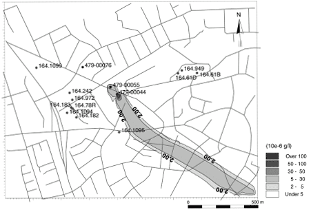Risikovurdering af MTBE-forurening i forhold til grundvandet - bilagsrapport 5 Bilag 4: stoftransportsimuleringBilag 4.1. Beregnet udbredelse af MTBE-forurening i den øverste del af det primære magasin (konservativ transport).