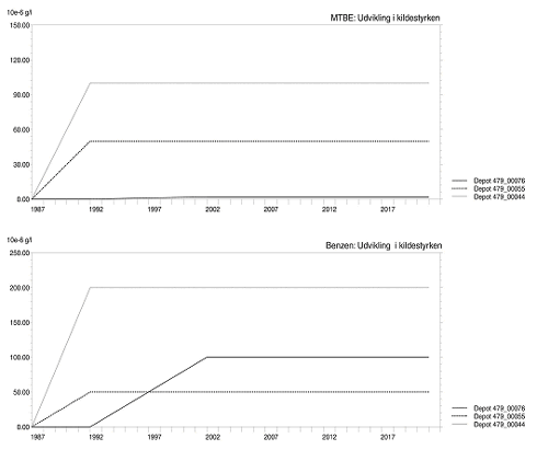 Benzen sorption og nedbrydning: Udbredelse efter 1 års simulation (2010) Bilag 4.9. Udvikling af MTBE- og benzen-forurening i den øverste del af det primære magasin under lokaliteterne (konservativ transport). Supplerende stoftransportscenarie