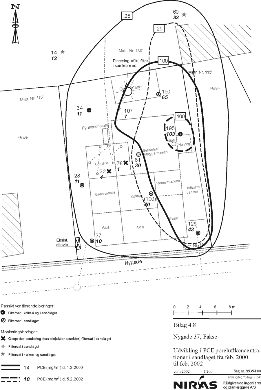 Udvikling i PCE poreluft koncentrationer i sandlaget fra feb. 2000 til feb 2002
