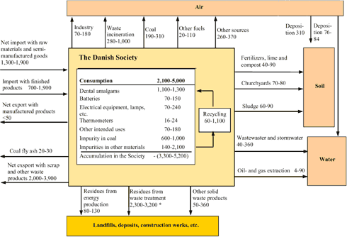 Figure 1 * Most of this (1,900-2,900 kg mercury per year) is exported. Releases to the environment Disposal and releases of mercury to the environment are shown in Figure 1. The total releases to the environment were 820-2,000 kg mercury to air, 50- 460 kg mercury to water and 170-270 kg mercury to soil. Emission to air The principal source to emission to air is solid waste incineration, which is assessed in particular to be due to the supply of mercury with batteries, dental fillings and electrical switches and relays. The second largest source for emission of mercury to air is coal-fired power plants with 193-310 kg mercury annually, while cremation contributes with 170-190 kg mercury per year to air. Discharges to aquatic environments Emissions to water are due to wastewater (treated) from municipal sewage treatment plants, which are primarily receiving mercury from dental clinics. Releases to soil Emission to soil is in particular due to sewage sludge from municipal sewage treatments plants (dental clinics) and churchyards (dental fillings). Recycling The ongoing collection of mercury and waste containing mercury is considerable. The yearly collection contains 2,000-3,900 kg of mercury of which the majority is exported. Landfilling About 2,400-3,700 kg of mercury was landfilled (including deposits, constructions work etc.). The main source was residues from solid waste incineration. Mercy in residues from solid waste incineration is primarily found in residues from flue gas cleaning; these products are exported to deposits abroad. Stock building As stated in Figure 1 the result is a negative stock building of mercury in the Danish society of 3,300-5,200 kg/year. These figures illustrate that the consumption of mercury is decreasing and that the existing stock of mercury in the Danish society (e.g. electrical switches and relays in old telephones) is being reduced. The total stock of mercury in the Danish society (i.e. the mercury in use in miscellaneous products) was for 1992/93 estimated at 50-250 tonnes (Maag et al. 1996). The amount of mercury removed from the stock in the period up to 2001 is not known precisely, but may roughly be estimated at 40 tonnes. Thus, the existing stock of mercury may likely be estimated at around 10-210 tonnes. The continued flows of mercury to disposal indicate that the accumulated amount of mercury in the society may originally have been underestimated, and that the "detoxification" of the society therefore takes more time. There is however no basis for an actual quantification.