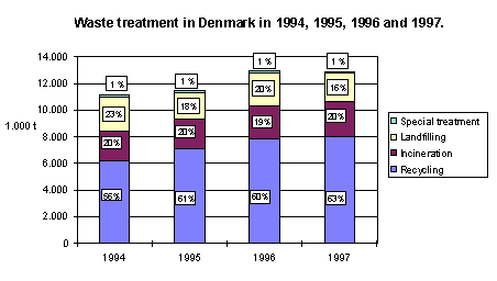 Total waste amounts increased from 1995 to 1996 by 10 per cent, but decreased by 0.5 per cent from 1996 to 1997. Overall objectives for waste treatment year 2000 have been met45. Total waste generation was relatively stable from 1996 to 1997. This is mainly due to a decrease of 24 per cent in amounts of residues from coal-fired power plants, and an increase in construction and demolition waste of 11 per cent. Waste amounts from industry, the service sector and wastewater treatment plants only increased by 1 to 4 per cent, and household waste arisings were stable. In Denmark, 12.9 million tons of waste were generated in 1997 (see Table 1). Of this, 2 per cent was hazardous waste46 and 7 per cent packaging waste47.