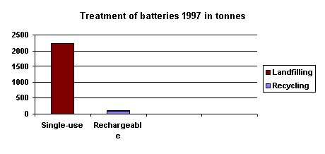 In 1998 around 2,500 tonnes batteries were sold of which 260 tonnes were rechargeable. According to assessments, some 120 tonnes of waste nickel-cadmium batteries were generated in 1997. Of these, 95 tonnes were collected for recycling. Nickel-cadmium batteries and lead accumulators are reprocessed in Sweden or France. Experience from many years' collection of batteries in Denmark shows that it is difficult for consumers to distinguish between different types of battery, despite the fact that recyclable batteries carry a special recycling label. The result is that many consumers either collect all batteries regardless of type, or dispose of all types in domestic waste. As a consequence, around half the discarded batteries are collected as a mixture of single-use and rechargeable batteries. The rest are disposed of in domestic waste. Local authorities, municipal waste companies, and Kommunekemi A/S separate Ni-Cd batteries for recycling. The rest of collected batteries are landfilled. Mercury-bearing batteries are normally landfilled at the Kommunekemi A/S special landfill site, and other types at conventional landfills.