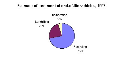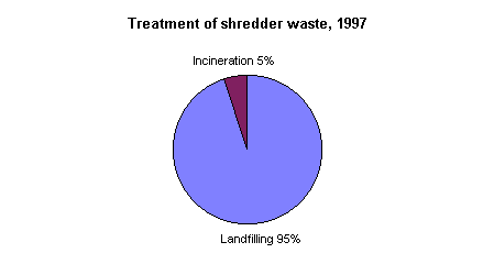E 2.1 Status Different waste fractions are generated both before and after shredding (scrapping) of vehicles. End-of-life vehicles contain waste such as iron and metal parts, tyres, plastic, glass, oil, and other liquids. For tyres, waste oil, and lead accumulators special schemes have been introduced, and they are described under the relevant sections of this Appendix. After shredding, recyclable fractions such as iron, aluminium, and copper arise. The residue (shredder waste) is landfilled today (see also Section E 20). End-of-life vehicles contain environmental contaminants, which end up in residues from incineration plants and at landfills. Management of end-of-life vehicles will be improved, ensuring increased recycling and environmentally appropriate treatment of environmentally harmful fractions. In 1997, around 130,000 tonnes of vehicles were discarded, of which around 1,000 tonnes were hazardous waste. A rough estimate shows that 95 per cent of waste from ELV is collected via car scrappers and similar service enterprises, and 5 per cent comes directly from industry. Of total amounts of waste from ELV, it is assessed that around 75 per cent was recycled and around 20 per cent landfilled. The remaining 5 per cent was incinerated. The objective for year 2000 of 80 per cent recycling is to be achieved by increased recycling of tyres and windscreens85.