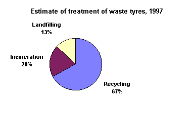 Tyres contain rubber, steel, and textiles. Waste tyres are an important resource which should be recycled or incinerated. Resource utilisation of waste tyres is not sufficient today. Until now, it has only been possible to recycle small tyres, and the objective for 1997 for recycling of such tyres has been achieved86. The objective before year 2004 is recycling or incineration of 80 per cent of all discarded tyres. In 1997, waste tyres amounted to around 40,000 tonnes, of which around 25,000 tonnes were recycled. The remaining part was incinerated or landfilled87. Around 40 per cent of total amounts of tyres is assessed to derive from private consumers, and 60 per cent is assessed to come from industry and commerce. It is furthermore believed that the major part of tyres is disposed of via the service sector. Studies on recycling of rubber powder have been started.