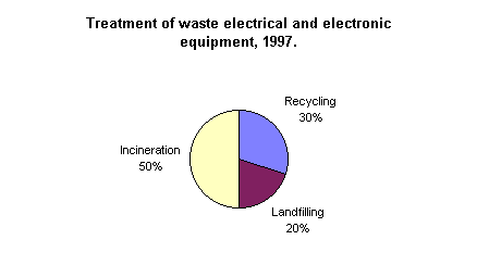 E 4.1 Status Electrical and electronic equipment primarily covers radio and television equipment, IT products, regulation and monitoring equipment, white goods, and office equipment. A special scheme for the treatment of refrigeration equipment exists, see Section E 11. Management of waste electrical and electronic equipment will be improved. Products are managed today in the conventional waste management system and account for a large part of environmental contaminants ending up in residues and landfills. Recycling of waste electrical and electronic equipment's contents of metals, glass etc. will be increased, and as far as possible this waste fraction will be kept away from incineration plants and landfills. Mass flow analyses for copper and lead show that 60 per cent of copper and 40 per cent of lead going to landfills and incineration plants derives from waste electrical and electronic equipment. Total amounts of waste electrical and electronic equipment, with a deduction of refrigeration equipment, which is discussed in Section E 11, have been calculated at 103,000 tonnes in 199791. The largest part is assessed to come from municipal bulky waste schemes (48 per cent). The remaining part is assumed to come from domestic waste (15 per cent), from institutions, trade and offices, the service sector (20 per cent), and industry (15 per cent). The remaining 2 per cent comes from the building and construction sector. Around 6,000 tonnes electronic equipment were subjected to special treatment in 1997, and 60,000 tonnes electrical equipment were mainly led to shredder plants. Against this background, it is assessed that around 30,000 tonnes were recycled in 1997, corresponding to around 30 per cent of calculated amounts of waste electrical and electronic equipment. A Directive on disposal and reprocessing of waste electrical and electronic equipment is expected to be presented in the EU in 1999.