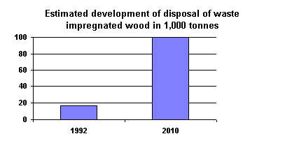E 8.1 Status Impregnated wood is treated with impregnators containing, for example, chromium, copper, arsenic (CCA), tin, and creosote. Impregnated wood containing heavy metals causes problems in incineration, as substances are not decomposed but remain in slag and flue gas waste. Creosote-treated wood (for example sleepers, wood from wharfs) can be decomposed in incineration, as creosote is destroyed. This requires, however, that such wood is pre-treated (crushed), ensuring complete incineration, and that the incineration temperature is sufficiently high. Sources of waste impregnated wood are primarily bulky waste and the building and construction sector. Impregnated wood is mostly disposed of today by landfilling, but small amounts of impregnated wood are incinerated. New and better treatment methods are being developed, allowing for utilisation of resources contained in impregnated wood (energy, chromium, cobber, arsenic). In the coming years, increasing amounts of waste impregnated wood are expected. It is assessed that since the 60s, around 2.7 million tonnes impregnated wood have been used (accumulated), and that in year 2010 it will be necessary to dispose of some 100,000 tonnes impregnated wood101.