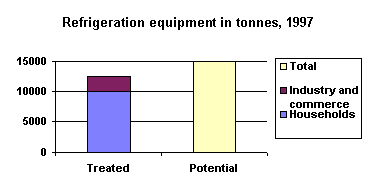 Refrigeration equipment contains CFCs and other environmentally harmful fractions. Refrigeration equipment must be managed in an environment-friendly way, and separation of environmental contaminants for separate treatment must be ensured. Furthermore, separation of recyclable fractions (iron and metal parts) must be ensured. For waste electrical and electronic equipment a special scheme exists (see Appendix E 4). Total amounts of waste refrigeration equipment were around 15,000 tonnes in 1997. It is estimated that 12,500 tonnes of refrigeration equipment were collected in 1997, corresponding to 83 per cent of the potential. 80 per cent of waste refrigeration equipment is collected in municipal bulky waste schemes, and 15 per cent derives from institutions, trade and offices. The remaining 5 per cent is collected from industry.