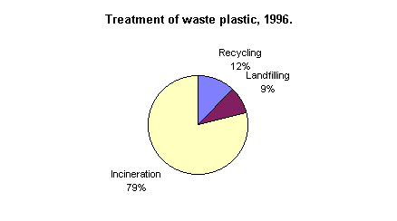 In Denmark, plastic consumption is stated at around 420,000 tonnes, and waste amounts at around 240,000 tonnes in 1996122. Amounts of plastic in waste are estimated lower than consumption, as plastic is part of many products with a very long useful life, such as water and sewage pipes, electricity and telecommunication cables, district heating pipes, and building materials. Consumption of plastic packaging in 1995 has been calculated at some 150,000 tonnes. Plastic accounts for some 7 per cent of domestic waste, corresponding to around 120,000 tonnes in 1996. Of this, plastic packaging is the dominant part and corresponds to 90,000 tonnes. Almost all plastic in domestic waste is incinerated. In 1996, around 29,000 tonnes of plastic were recycled; of this, just below 13,000 tonnes were packaging waste from industry and commerce.