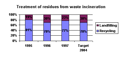 Residues from waste incineration contain heavy metals. Residues cover slag and flue gas cleaning waste, including fly ash. In 1997, 82 per cent of slag was recycled, and the rest was landfilled. Flue gas cleaning waste is now being stored temporarily, but a permanent solution is being established. Requirements for recycling of residues will be adapted so that groundwater resources are protected. The objective of recycling residues from incineration plants has been achieved126, as 77 per cent of residues from waste incineration plants was recycled in 1997. In 1997, 493,800 tonnes of slag and 61,300 tonnes of flue gas cleaning waste were generated. Flue gas cleaning waste contains large amounts of environmental contaminants, and it results in very high leaching of salts and heavy metals. Flue gas cleaning waste is classified as hazardous waste. Slag and flue gas cleaning waste are generated at 31 waste incineration plants and Kommunekemi A/S, as well as the special incineration plant SWS. Slag from waste incineration is primarily recycled in building and construction works. Present criteria for recycling will be adjusted so that groundwater resources are protected. In 1997, around 35,000 tonnes of flue gas waste were stored in temporary storage, and around 25,000 tonnes were exported for landfilling in Norway and Germany. Temporary storage is used, as so far no suitable methods for stabilisation of flue gas waste have been developed, and no suitable locations for landfilling of stabilised flue gas cleaning waste found. A method for stabilisation of flue gas cleaning waste has now been developed. Dansk Restprodukthåndtering, Danish Residues Treatment, has carried out pilot tests of the method, but full-scale tests are still outstanding.