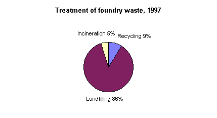 E 22.1 Status Foundry waste accounts for a large part of landfilled industrial waste. Suitable recycling possibilities have been developed for this waste, and they are now gaining ground in the foundry industry. The foundry industry covers just below 40 foundries (10 iron foundries, the rest metal foundries) with between one and 300 employees. In 1997, 95,000 tonnes of foundry waste were generated. Environmental problems related to foundry waste primarily derive from discarded foundry sand, amounting to 80,000 tonnes per year. Such sand contains chemicals which are used in the production of moulds. Around 5,000 tonnes of slag are generated each year. Furthermore, around 400 tonnes of furnace filter dust are generated that are classified as hazardous waste. The foundry industry has started introducing environmental management. Experience from the industry (from black sand foundries) has shown that environmental reviews of enterprises may lead to a reduction in waste amounts of around 20 per cent. Good treatment methods have been developed, so that, for example, black sand can be recycled, and zinc and lead can be extracted from filter dust. The industry is investigating possibilities of recycling slag from melting furnaces and foundry ladles. Technically, large parts of waste generated at foundries can be recycled today.