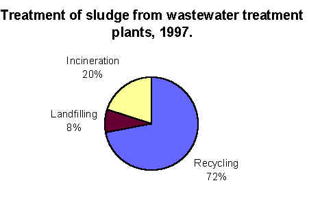The contents of both fertiliser and energy in sewage sludge may be utilised in recycling. Today, it is often only the fertiliser content that is recovered, as sewage sludge is applied directly to farmland due to the content of nutrients, especially phosphorus. In 1997, around 1,209,000 tonnes sludge (wet weight) were generated at municipal wastewater treatment plants. Of this, 72 per cent was recycled, fulfilling the Government's objective for 50 per cent recycling in year 2000. 20 per cent was incinerated and 8 per cent landfilled.