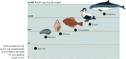The use of TBT on ships smaller than 25 metres is now prohibited in Europe, and work is in progress on an international ban for all ships from 2003. New and environmentally less hazardous ships' paints are fortunately emerging on the market. But many years will elapse before TBT entirely disappears. Large quantities of TBT are bound to particles in the sea-bed, where it degrades only slowly and continues to constitute a risk through potential uptake in the marine food chain.