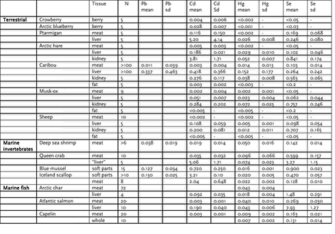 Table 3.4 lists levels of lead, cadmium, mercury and selenium in marine, freshwater and terrestrial species from Greenland. These were extracted from a Greenland contaminant database (Dietz et al. 1996, Dietz et al 1997, Riget et al. 2000) and from the diet study initiated in 1999. Data from all regions in Greenland are included, but only for datasets with at least 4 individuals analyzed.