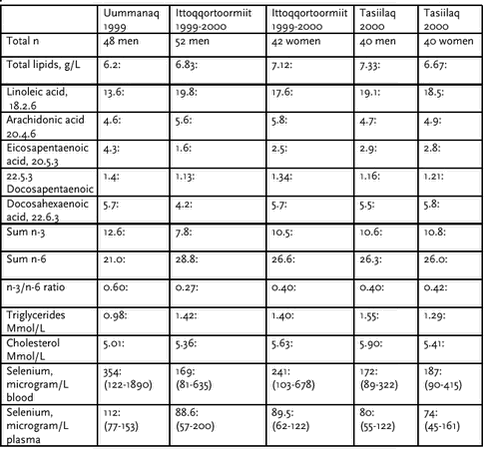 Whole blood selenium was also highest in Uummanaq namely 354 microgram/litre and lowest in Nuuk (140 microgram/litre). A high Selenium level indicates a high intake of meat from marine animals and in particular of muktuk.