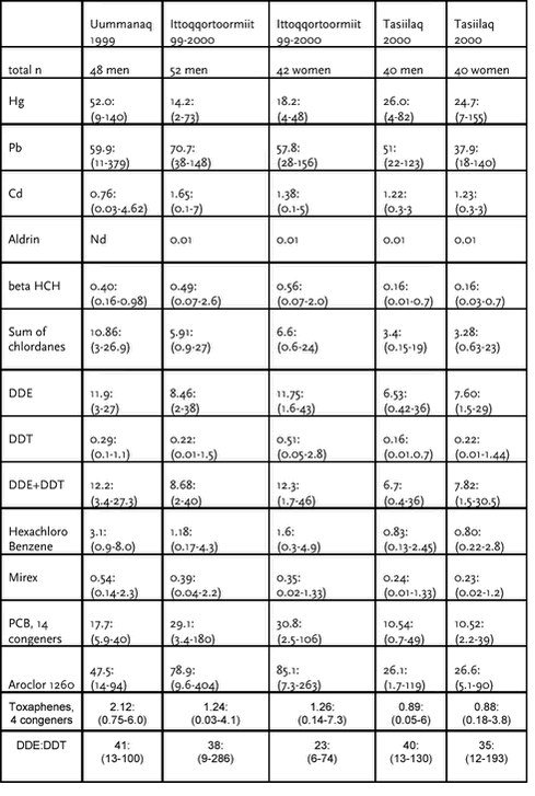 Hexachlorophene, betaHCH and Toxaphenes were relatively evenly distributed geographically but chlordanes , DDTs and particularly PCBs were at very high levels in Ittoqqortoormiit, in fact the PCB levels were about 3-4 times higher than in the other locations, and should be considered the highest measured among Arctic populations (AMAP International report, Human Health 2002)