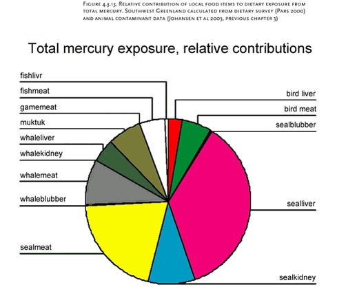 Figure 4.3.14. Relative contribution of local food items to dietary exposure from bioavailable mercury. Southwest Greenland calculated from dietary survey (Pars 2000) and animal contaminant data (Johansen et al 2003, previous chapter 3)